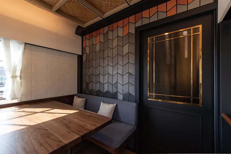 ▲車內能看到八女竹編天花板、福岡城島瓦壁面,以及480年老舖「大川家具」的桌椅等,每一處都融入福岡在地元素。