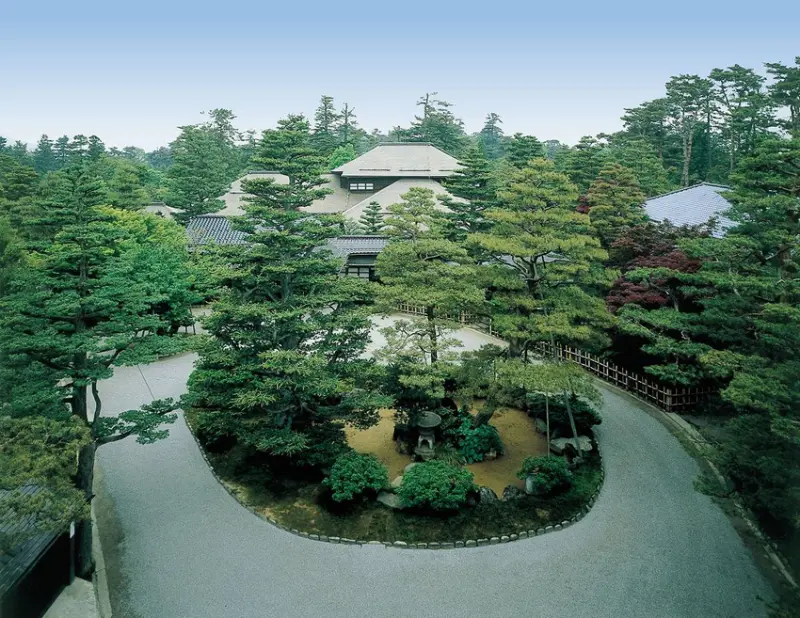 加賀藩藩主前田齊泰為了讓母親頤養天年所造的居所,1樓為華麗的武家書院建築,可見精緻的鏤空花鳥木雕、金箔粉末的壁紙等充滿雅趣的設計;2樓為數寄屋風書院建築,房間的配色大膽,融入了中國與西洋的建築特色,細部刻畫細緻入微。整體建築展現了武家的氣派,又不失女性的優雅。