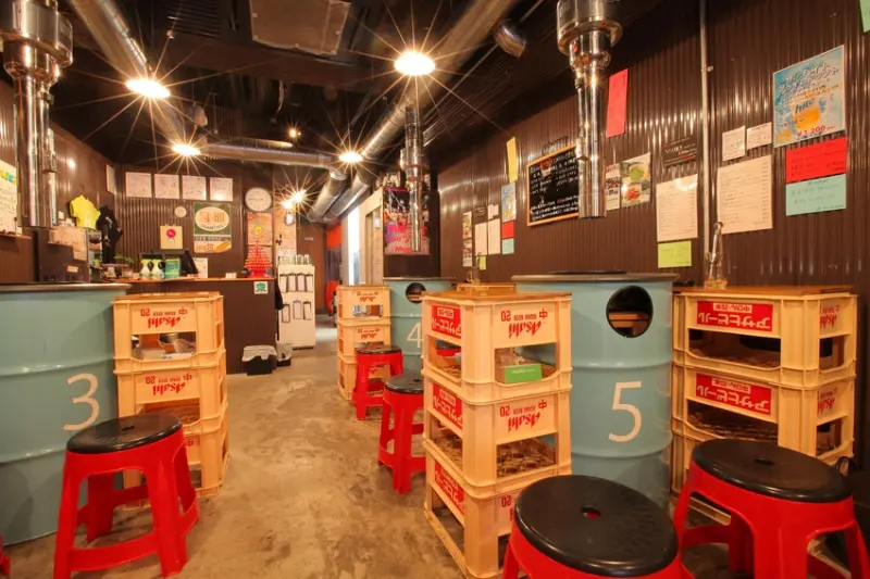 ▲以直立的鐵桶為桌,可站著吃、也可做在板蹬上品嚐的獨特燒肉店,十足韓國風情。
