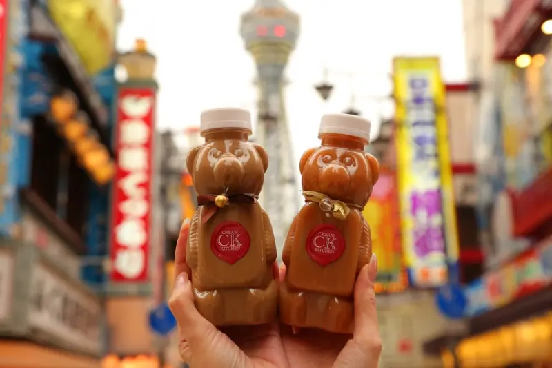 ▲クマボトル(小熊瓶裝飲)¥700/共有焦糖奶茶、楓糖拿鐵2種口味,可愛的包裝非常適合與通天閣合影留念。
