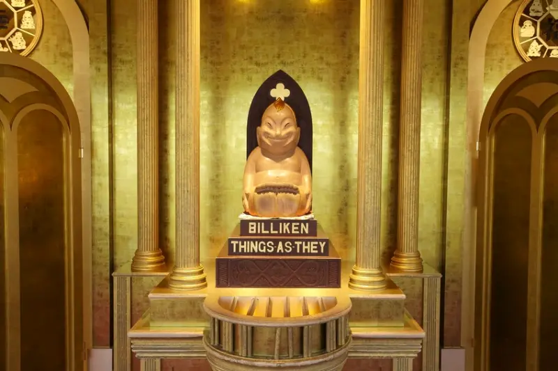 ▲來自美國的比利肯(Billiken)甚至加入了日本七福神信仰,形成當地獨特的「八福神巡禮」傳統,是深受大阪人喜愛的福神。