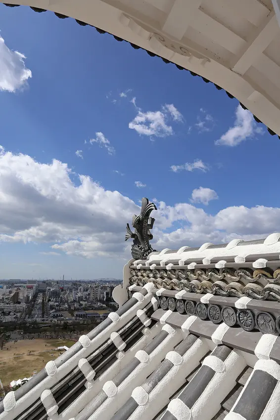 ▲從天守能見鎮火的魚尾虎頭鯱瓦,張口為雄、閉口為雌,一般位東為雄位西為雌,據傳因天守位西而皆放雌鯱瓦。