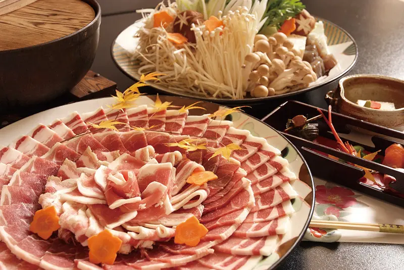 ▲¥13000起/人的1泊2餐方案中,晚餐可享用鈍川名物猪豚鍋,是山豬與豬交配的品種豬。