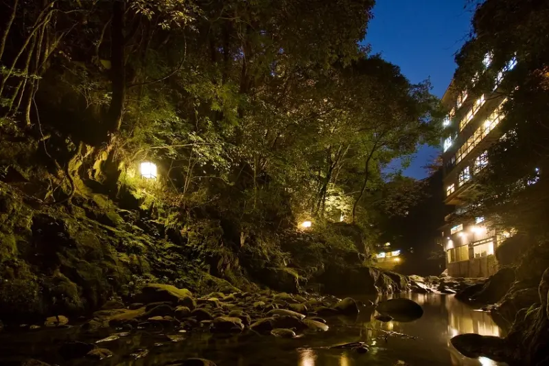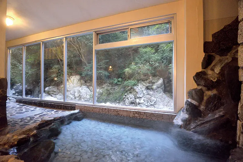 ▲被自然綠意環繞的美賀登,館旁就是溪谷,在大浴場內可邊享用美人湯,邊眺望溪谷美景。