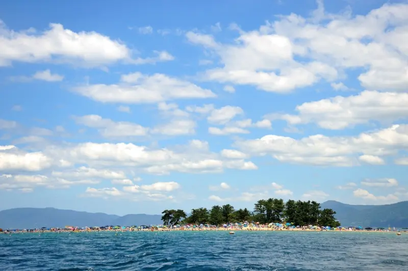 自緊鄰京都府的若狹沿日本海繼續向東行,便會來到福井重要的交通樞紐敦賀。不妨趁著夏季,前往敦賀半島外海的無人島「水島」,感受海天一色的絕景旅程。全長僅500公尺的小島,彷彿是浮現在海中央的夢幻樂園。連接敦賀與水島的渡船每年只有7月上旬~8月下旬行駛,島上除簡易公廁及夏季限定的超商外,沒有任何人工設施,在清透的海岸,徹底享受絕景無人島之美。