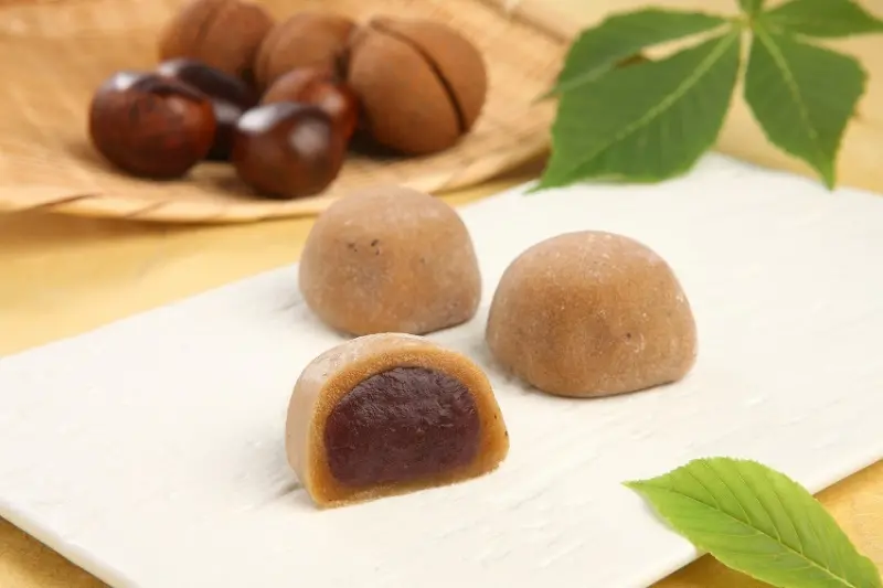 ▲白とち餅(白栃餅)800/6入/創業以來的暢銷商品,秘方栃果麻糬內包有紅豆餡。