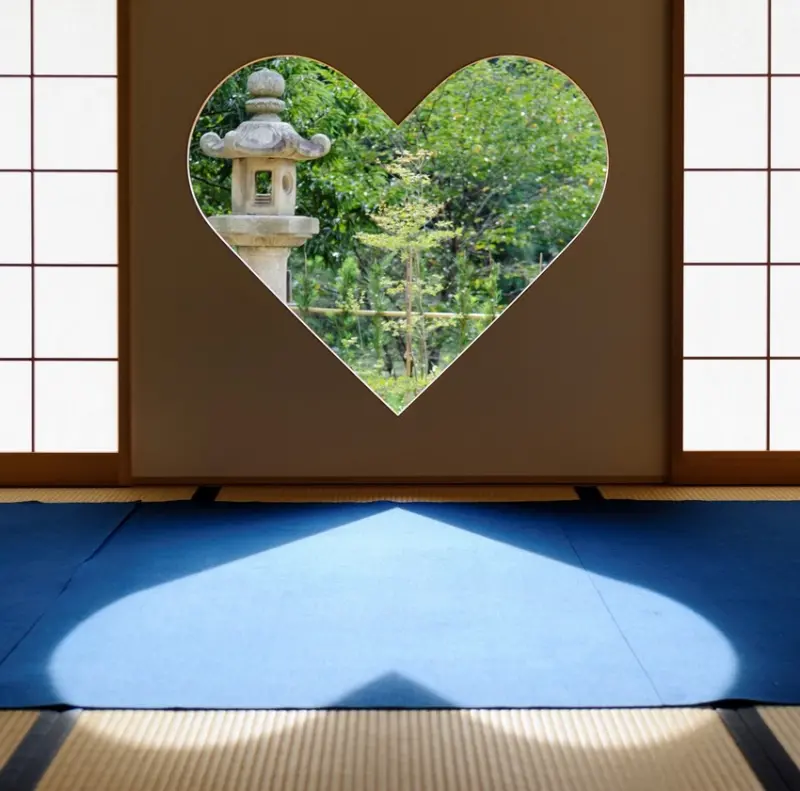 ▲光線透過愛心形狀的「豬目窗」灑落在榻榻米上,上下2個愛心形成夢幻畫面。