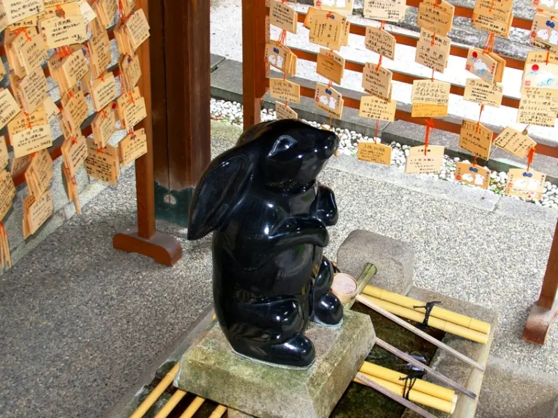 位於京都岡崎一帶,近平安神宮的岡崎神社,是8世紀末桓武天皇遷都平安京時創建的護城神社,也是安產的靈驗之地。最特別的是岡崎神社以可愛的小兔子作為氏神的使者,腹地內處處可見可愛的兔子雕像、兔子籤、兔子御守及兔子繪馬等,讓按下快門的手始終停不下來。