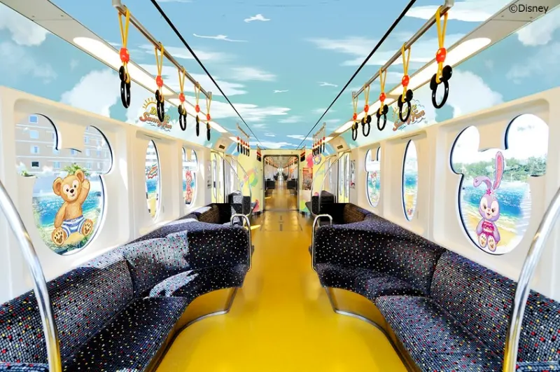 東京迪士尼海洋最受矚目的人氣明星「達菲與好朋友們」化作連結海洋與陸地2園區的「彩繪列車」。配合夏日主題,穿上花襯衫、泳裝的達菲與好朋友們萌度爆棚,讓粉絲們直呼「太可愛了~」。整台列車洋溢著夏季的氣息;走進車廂,從窗戶到天花板都讓人感受到東京迪士尼的用心,化作加州海灣藍天白雲的天花板與有如沙灘的黃色地板,彷彿來到海邊;而窗戶則是印滿了達菲與好朋友們的圖案。