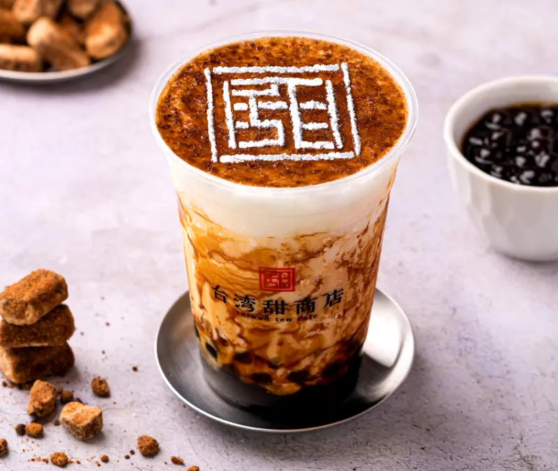 ▲甜黒糖クリームミルク(黑糖厚鮮奶)¥724/從店舖到甜點、飲品都帶有濃濃懷舊台灣味的「台灣甜商店」,2019年新推出的人氣品項,黑糖珍珠加上黑糖鮮奶,再蓋上綿密奶油,超滿足的一杯。