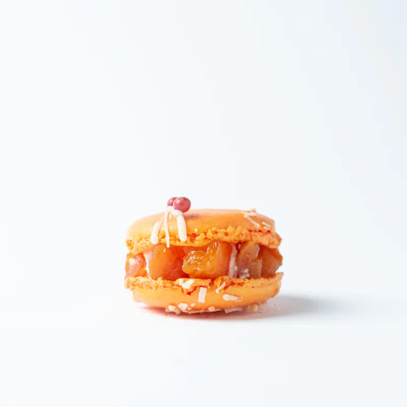 ▲杏子馬卡龍¥380/椰香馬卡龍包夾著杏子奶油,再灑上漿果,層次豐富的絕佳口感。