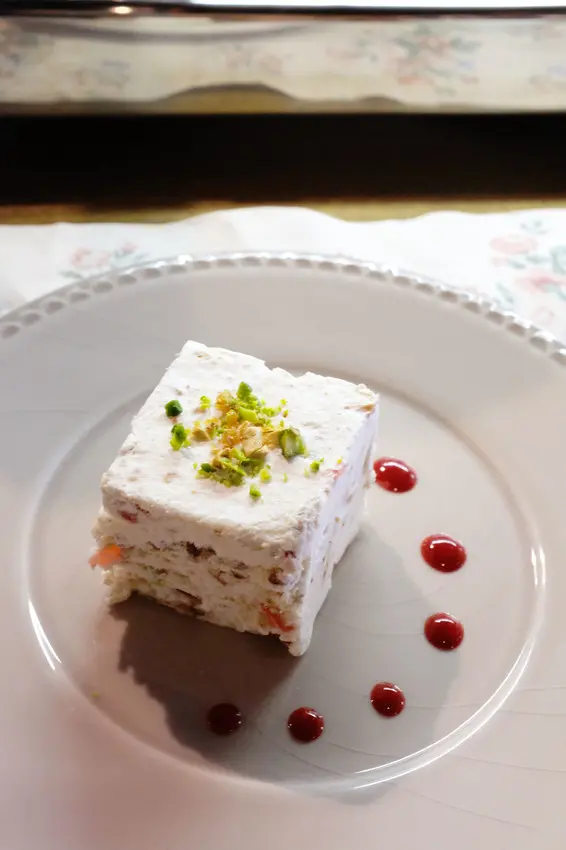 牛軋糖冰淇淋蛋糕榮登我心目中的最獨特甜點No.1!吃起來像是慕斯加上冰淇淋,還帶有徵徵的酒香與奶香,再加上堅果及莓果醬,交織出超完美的口感!(¥500/個)