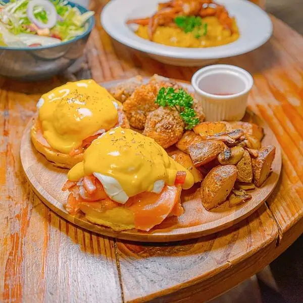 他們的水波蛋就是班尼迪克蛋~最底下是一片麵包,放上洋蔥、燻鮭魚後,最上層疊顆班尼迪克水波蛋再淋上起司荷蘭醬,對半切開便會看到金黃色蛋液流淌而出,底層麵包濕潤,有點像是法式麵包的口感,但卻多了豐厚蛋香。