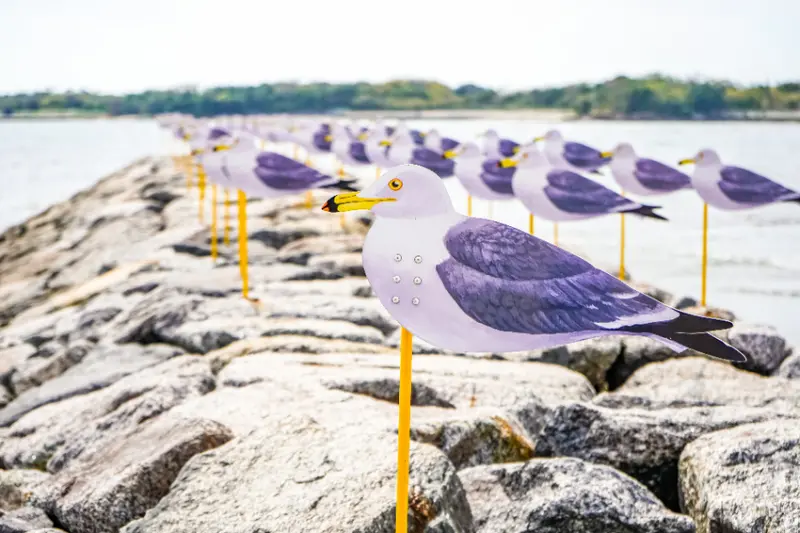 ▲關於風的藝術品「海鷗停車場」,每當有風吹來就會發出海鷗的聲音,並隨風吹改變方位,是童心未泯的作品。