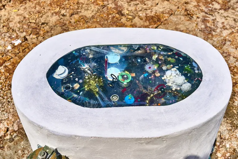 ▲2012年作品「愛慕星星之椅」在2017年以「愛慕星星之地」重生,探頭看會發現裡面有在島上海邊收集的貝殼、星砂跟海草。