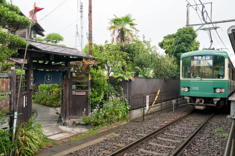 ▲無心庵的門口就位於江之電行經的鐵軌旁。