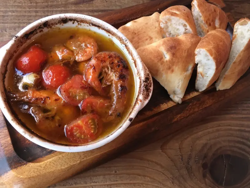 ▲エビのアヒージョ フォカッチャセット(蒜香橄欖油蝦組合)¥972/以西班牙道地的手法製作,帶出鮮蝦的甜味。