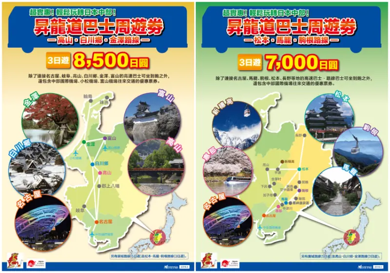 ※持昇龍道巴士周遊券3日券(高山・白川鄉・金澤路線)、3日券(松本・馬籠・駒根路線)、5日券(廣域路線)享優惠