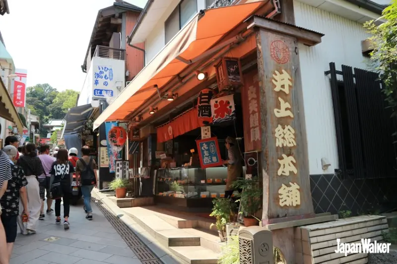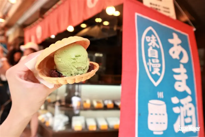參道兩側有許多人氣小吃、老鋪,這家「井上總本舖」是必吃的人氣名店,販售各種功力深厚的和菓子、和風甜點。最受歡迎的冰淇淋最中餅,是在酥脆的最中餅中,包夾冰淇淋及內餡,冰淇淋可從抹茶、香草、紅豆3種中選擇,內餡則可選擇顆粒豆沙、豆沙,或是不加豆沙,都能任意搭配,外帶¥400、內用¥500。別看這樣一個不算大最中餅,用料紮實,酥脆最中餅與濃郁冰淇淋搭配的恰到好處,也可和同行的朋友一同分食,吃完飽足感滿滿。