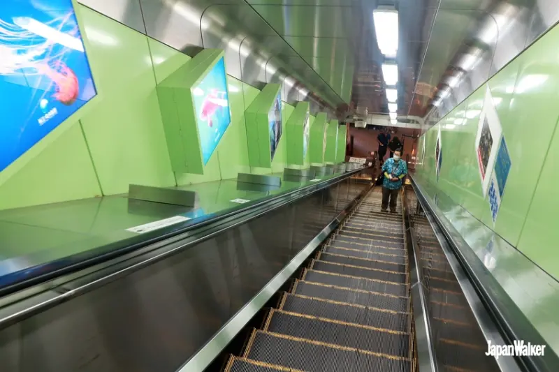 走下電扶梯後,右手邊的自動門旁就是更大的「鐵道」標誌,繼續順著標誌前進即可。此時,自動門的右邊則是大量的扭蛋機,若想要先花點零錢扭一下也不錯。