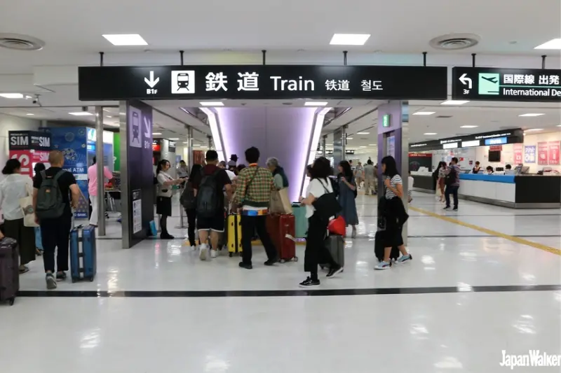 訂購完成後,就可以準備搭車啦,成田機場第2航廈出境後轉乘電車非常方便。一走出出境出口,就會看到前方有大大的「鐵道」標誌。依照標誌向左轉,馬上又會看到電扶梯上方寫著大大的「鐵道」,再繼續依照標誌下電扶梯。