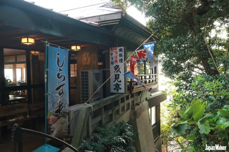 搭乘3段電扶梯,一一造訪邊津宮、奧津宮後,便來到江之島的最深處,也是地勢最高的地方。蜿蜒的小徑蔓延在起伏的山間,其中散落著眾多個性店鋪,也有不少超過百年的老舖,可以說說步步驚喜。小編來到的是江之島最知名的人氣老舖,創業已經超過140年的「魚見亭」。 魚見亭地理位置得天獨厚,就位在斷崖上,魚見亭也利用此地理位置,打造了戶外的露天席,眼前是一望無際的大海,老鷹就在前方翱翔,腳下的斷崖下方,則是江之島最負盛名的夕陽賞景勝地「稚兒之淵」,令人驚呼的震撼美景,可以說是「真.海景第1排」。在絕景前,品嚐一份鮮度一流的江之島名產吻仔魚丼,享受那入口即化的美味,真的是至福時光。