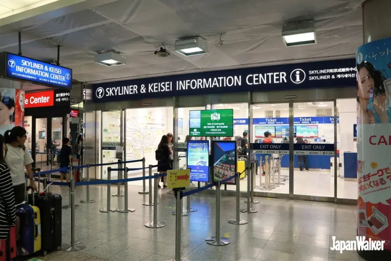 走出自動門,就是通往電車月台的區域,這裡共有JR與京成電鐵2種鐵道匯集,依自己要搭乘的列車前進,可別走錯了。左手邊可以看到紅色的JR票務窗口,與藍色的京成電鐵票務中心;右側則是京成電鐵的一般售票櫃台及剪票口。若你是已經在網上訂購優惠票,要去兌換的話,請千萬不要前往一般售票櫃台,而是要到左手邊的票務中心,才能兌換哦。到窗口出示護照及手機中的「兌換號碼」,就能拿到來回車票了。