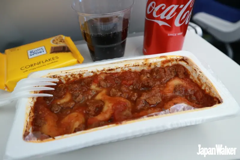 訂票時若有選購餐點,起飛後不久空服員就會送上餐食,此時記得要拿出登機證讓空服員確認姓名是否無誤哦。如果沒有訂購,卻突然想吃東西,也可以直接訂購,都很方便。既然是新加坡的航空,當然要來吃點道地的!小編點了「椰漿飯」,吃起來口感道地,微辣又有料,同行姐妹則是點了「牛肉千層麵」,吃起來也是相當道地毫不馬虎!2份套餐都附可樂(也可選擇礦泉水)和Ritter Sport巧克力,很滿足。