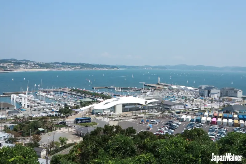 搭乘完第一段電扶梯,便來到位於最外圍的江島神社邊津宮,古色古香的神社香火鼎盛,能看到排隊參拜的人龍。一旁還能居高臨下,將剛才一路走來的弁天橋、參道、鎌倉,全都盡收眼底,眺望美景。此外,另一側的寬廣海域上,盡是無數的帆船,原來這裡就是2020年東京奧運的帆船賽事會場!