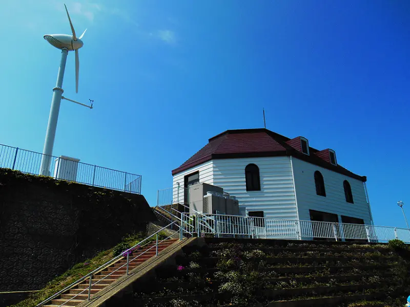 ▲白色風車與紅屋頂的建築,是公園的地標。
