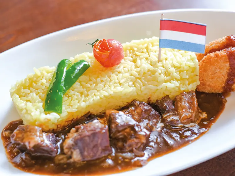 ▲荷蘭傳統料理牛肉飯,也能在此品嚐,上面還插著荷蘭國旗,重現過往意象。