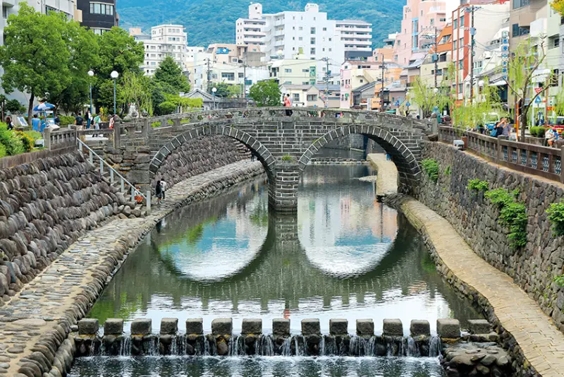 建於1634年的眼鏡橋,是日本第1座拱形石橋,也是長崎的地標,因2座拱形橋墩與映入河中的倒影形成2個圓圈,就像眼鏡一般,因而得名。橋下流洩的河道是中島川,也是長崎昔日貿易水路的分支。壯麗的石橋周邊種有繽紛花朵,還有愛心形狀的石頭隱藏在石壁中,玫瑰花冰淇淋也是常見的攤販,多種夢幻元素等待旅人的發掘。
