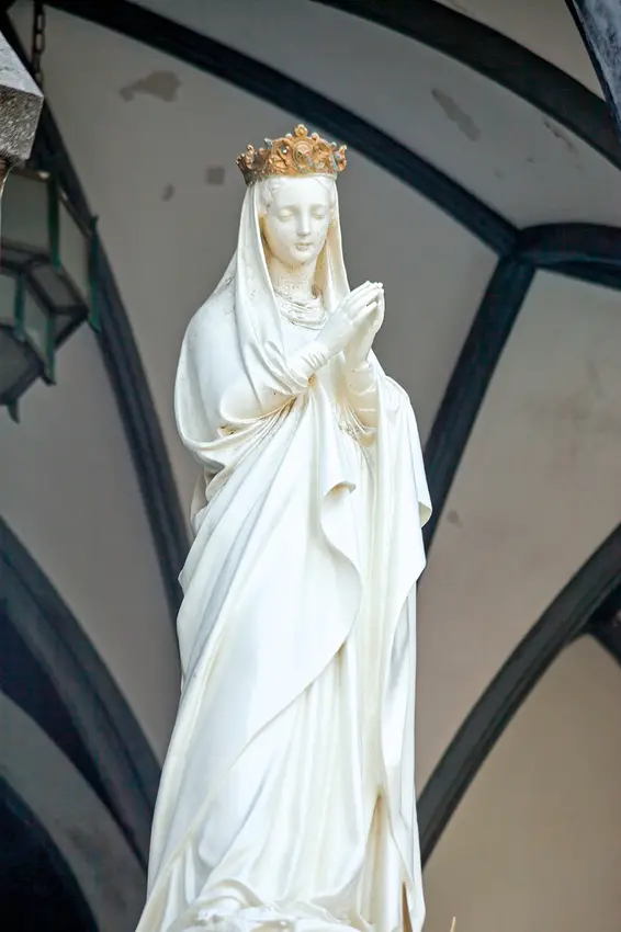 ▲正門外側設有法國贈送的聖母瑪利亞像,莊嚴又慈祥。