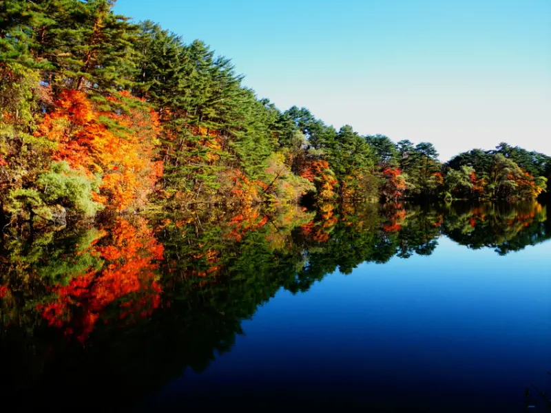 因磐梯山火山噴發形成的湖泊群「五色沼湖沼群」,共由大大小小30多個湖泊組成,在植物、礦物質與光線的折射下,呈現綠、紅、藍等多樣色澤,因而得名,2016年更獲米其林綠色指南1星評鑑。秋季清透空氣下湖面宛若鏡面,倒映著岸上楓紅,令人屏息的絕景值得一訪。