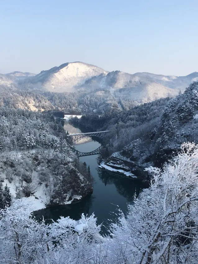 連接福島縣會津若松站和新潟縣小出站的只見線,由於路線途經只見川溪谷等地,山林景色優美,能欣賞四季風光,春粉櫻、夏新綠、秋紅楓,尤以冬白雪最引人入勝。列車行經白雪覆蓋的第一只見川橋梁時,如夢似幻的美麗畫面,成為吸引遊客造訪的誘因。