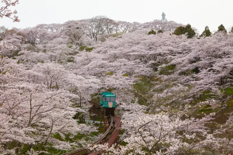 宮城縣內唯一入選「櫻花名所100選」的公園,可從停車場搭纜車前往公園山頂,約305公尺的軌道穿梭於櫻花隧道間,相當夢幻。上山後除了能欣賞聖潔的和平觀音像外,還能享受山頂獨有的絕美景致。4月上旬還有舉辦柴田櫻花祭,每年吸引約25萬名的遊客前來賞櫻。
