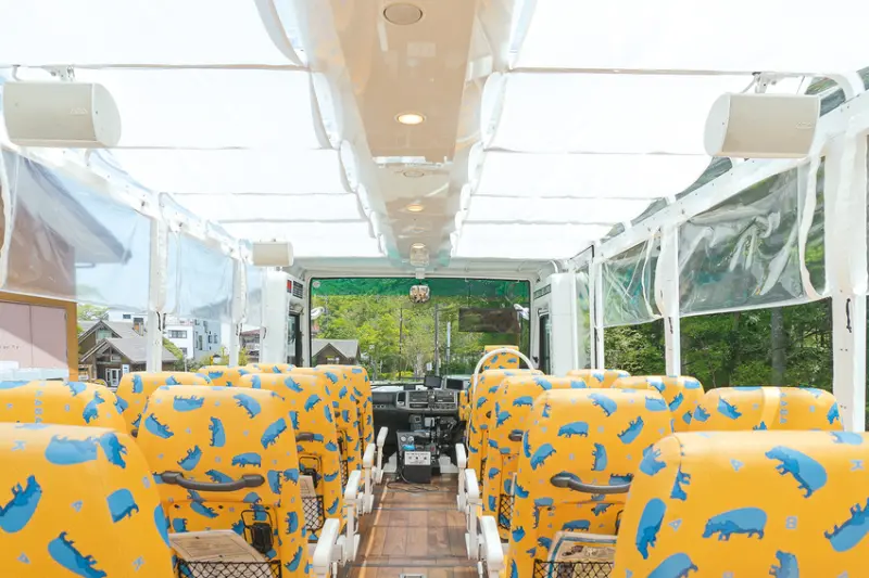 能行駛陸地與水中的水陸兩用巴士,是日本少數地區才能體驗到的獨特交通工具。這次就搭上這台山中湖河馬巴士,以不同角度領略富士山之美。上車後會先至山中湖的周邊森林進行導覽,由隨行導覽全程講解,幫助遊客深度認識山中湖之美,而後進入到備受矚目的環節,從陸地行駛進湖中,宛如坐上移動的遊樂設施,趣味十足。