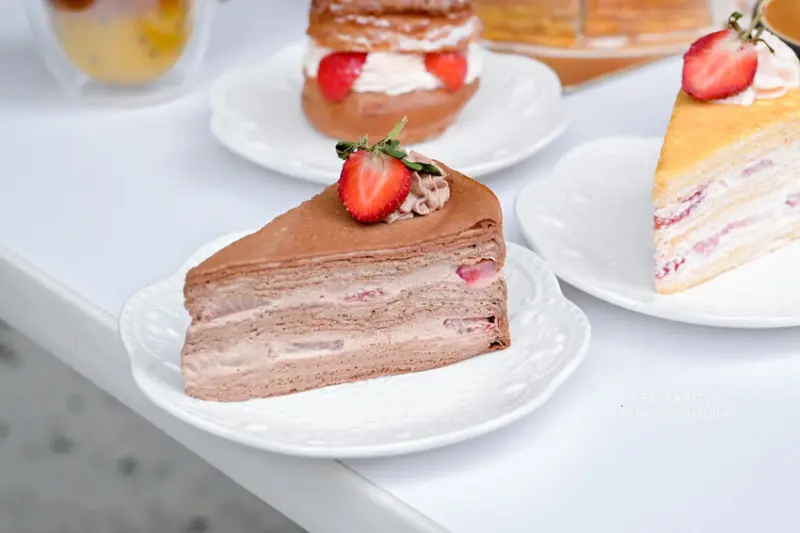 可可千層的升級版,層層堆疊的餅皮中還夾入了大量的草莓切片與店家特製草莓鮮奶油,吃起來酸甜可口,還帶著巧克力香甜苦韻,相當大推。