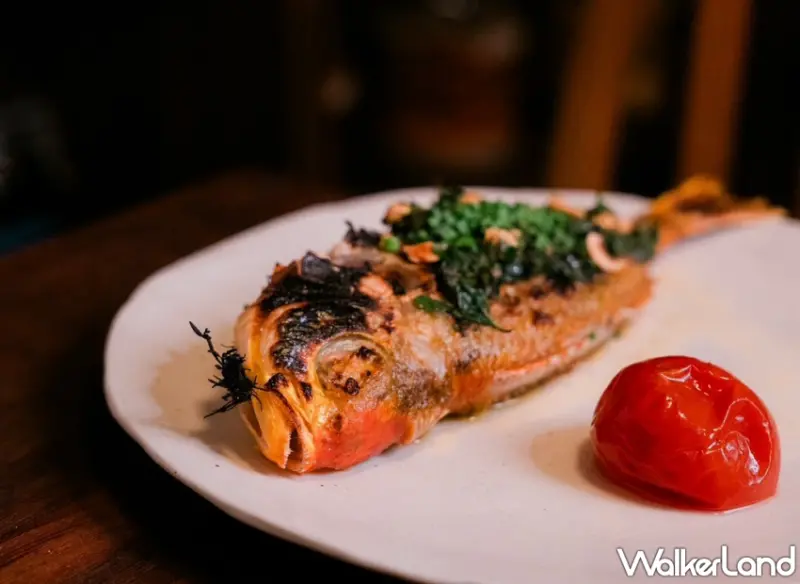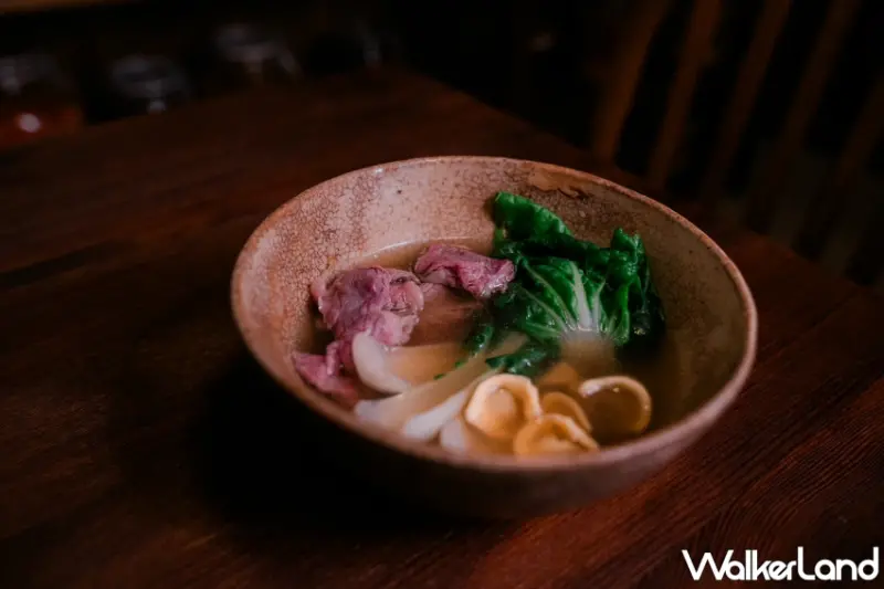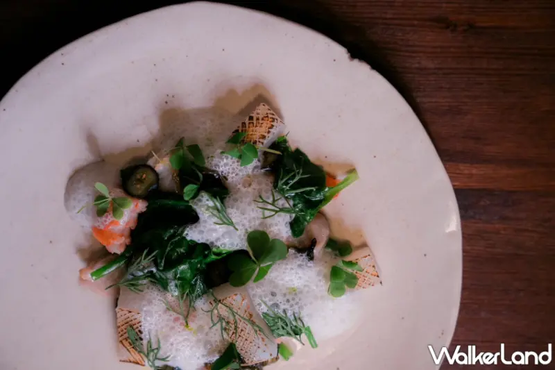 菜單的設計充滿即興創意,每道料理都展現Eric對食材的敏銳理解。燻鮭魚搭配以鮮奶油和優格發酵的起司,結合空氣薯泥與炸雞皮,層次豐富而充滿趣味;蛤蜊與墨魚的組合,則用泡沫狀蛤蜊醬汁和炭烤莧菜平衡海洋與大地的味道。靈感源自波隆那的牛肉湯餃更是驚豔,湯底由當地牛骨熬煮12小時,餡料以本地牛肉與義大利火腿調配而成,展現對台南與義大利飲食文化的融合。