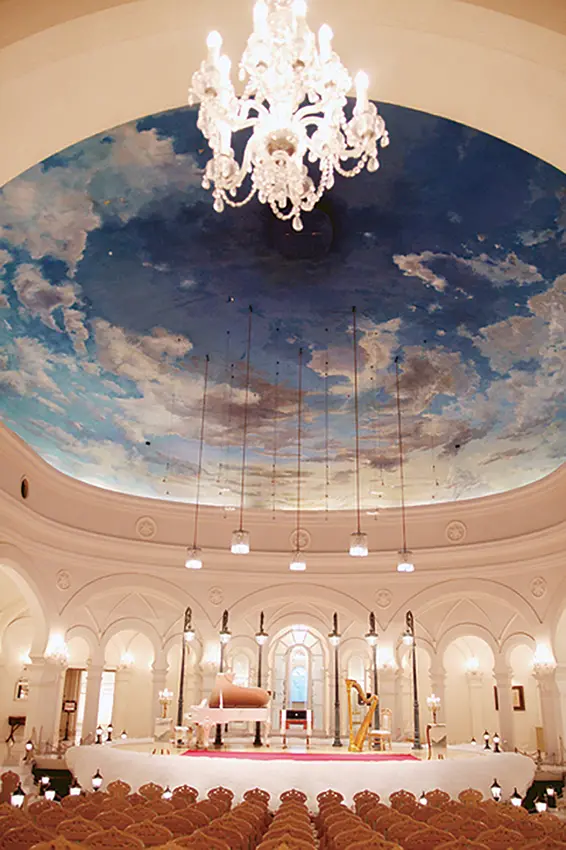 ▲美術館中央的音樂堂以白色為主設計,搭配天花板由7位畫家共同繪製的油畫。