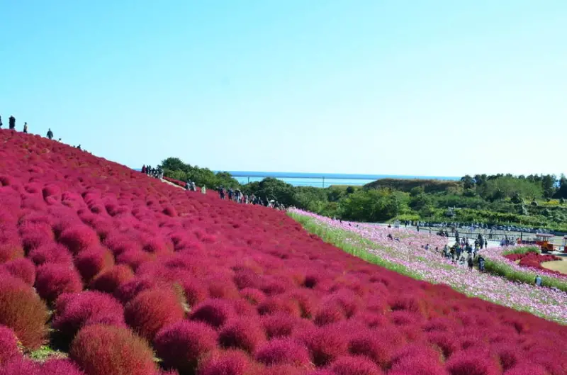 國營日立海濱公園的掃帚草約在每年9月下旬開始轉紅,到10月中旬正好是最紅色的時刻,園內也會配合時期舉辦掃帚草嘉年華會。此外,深秋~入冬時由紅轉為金黃色、又或是夏季的翠綠色,也都一樣迷人,值得一一造訪。而公園內也有粉蝶花等多樣的花卉,一年四季都能看到不同的花海美景。