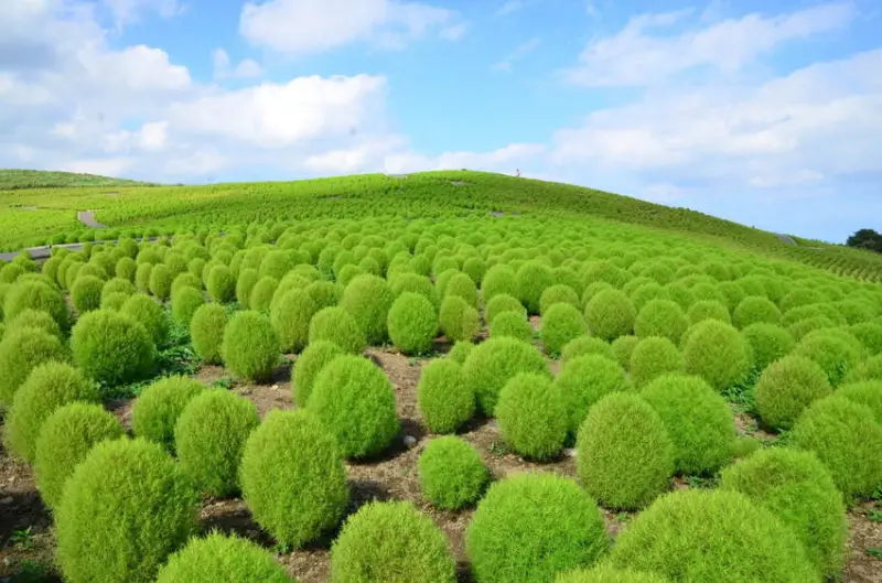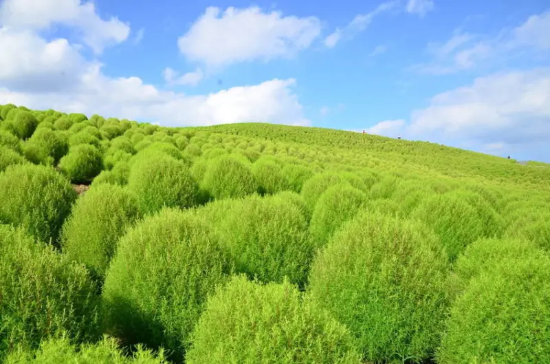 圓球狀的掃帚草,也有人暱稱為波波草,獨特的圓滾滾造型相當可愛,顏色更是會隨時季節而變換。夏季呈青翠的綠色、入秋會轉為火紅色,深秋~冬季則化為金黃色,每一階段都相當迷人。位於茨城縣海岸旁的「國營日立海濱公園」,一望無際的園內山丘「見晴丘」上,共有3萬2000株掃帚草,可以說是日本最大規模,能看到令人屏息的絕景。