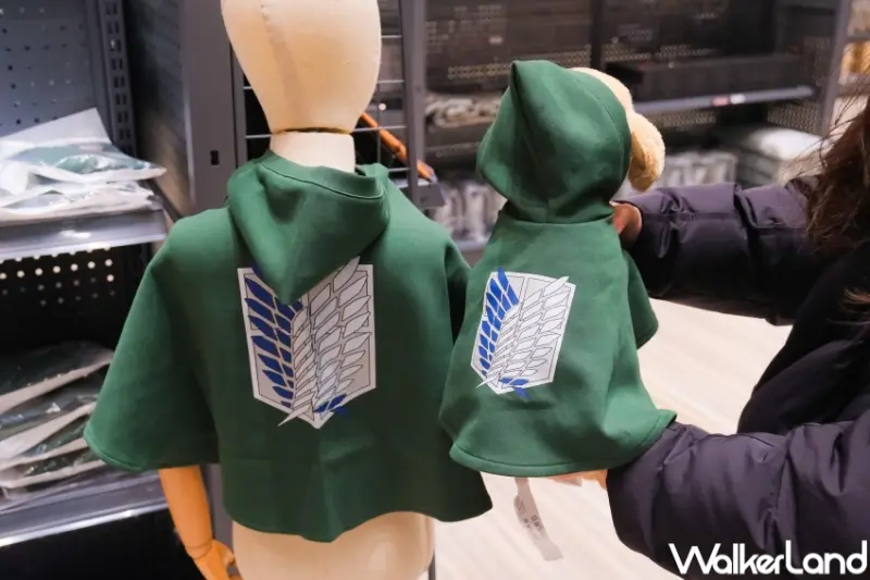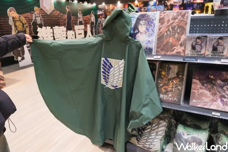 進擊的巨人快閃店推出近60款周邊商品,像自由之翼「防水披風」、夕陽下帥氣的艾連與里維「角色立牌」,以及超有質感的「鋁合金杯墊」。而超人氣「調查兵團披風」也推出多種不同選擇,包含連帽的毛毯、雨衣,還有小尺寸與寵物尺寸的小披風,讓粉絲的小孩、毛孩也一起嗨。