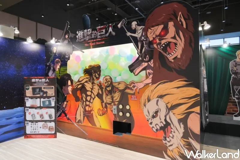 獻出你的錢錢!「進擊的巨人:Final Season」快閃店即日起登場,在A11館6樓就能看見超大、超高的巨人打卡牆,牆內還有扭蛋機台、以及各大角色集結的打卡點,整個牆面放滿了動畫回顧的照片,更是讓粉絲們一秒入戲。![]()