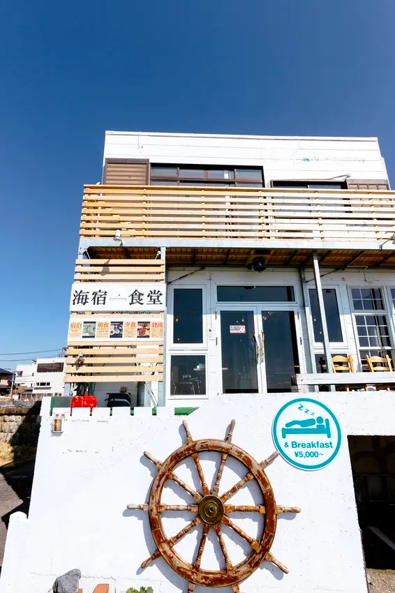 ▲坐落在海灘上的「海宿食堂Good Morning 材木座」,白色的外牆映襯著藍天與大海。
