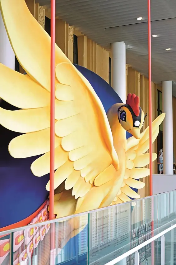 ▲手塚治蟲筆下的「火之鳥」木造雕像聳立在館內,氣勢磅礡。