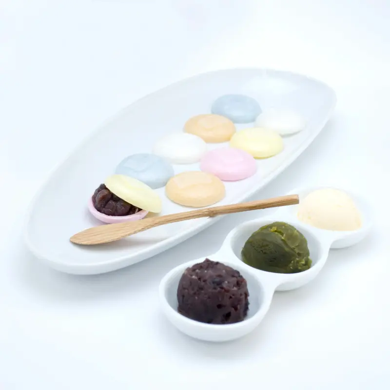 ▲もなかプレート(最中餅拼盤)¥972/宛如馬卡龍般的小巧最中餅,內餡有紅豆沙、抹茶豆沙及香草冰淇淋,可依喜好自行包夾品嚐。