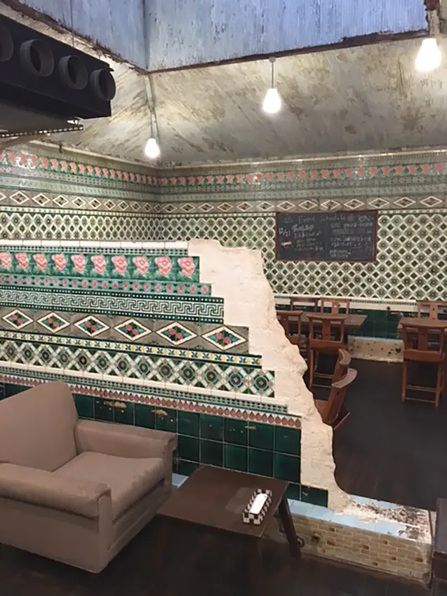 ▲只剩下一半的花紋瓷磚牆相當吸睛,客人能夠在古老錢湯的氛圍中度過獨特的咖啡時光。