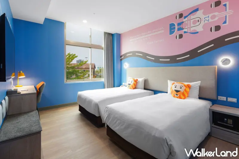 這次飯店重新設計的72間主題雙人房,延續了全館的賽車精神,並巧妙融合繽紛的撞色設計,呈現出不同風格的兩種房型。一款房型採用帥氣的藍黃撞色,並結合賽車手及速度線條,營造出一股強烈的動感與速度感。另一款則是柔和的藍粉撞色,搭配賽車模型及經典名句,營造出溫馨而富有知識感的氛圍。飯店更精心設計了富有故事性的主題廊道,讓每位小朋友一走進飯店大廳,就仿佛置身於童話世界,每個角落都藏有驚喜,無論是大人還是孩子,都能沉浸在這樣的快樂氛圍中。