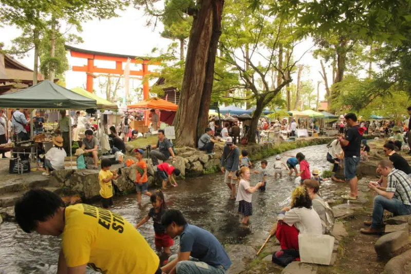 ▲神社境內的小川成了夏日市集絕佳的消暑聖地,將雙腳浸泡在清涼的溪水,十分愜意。